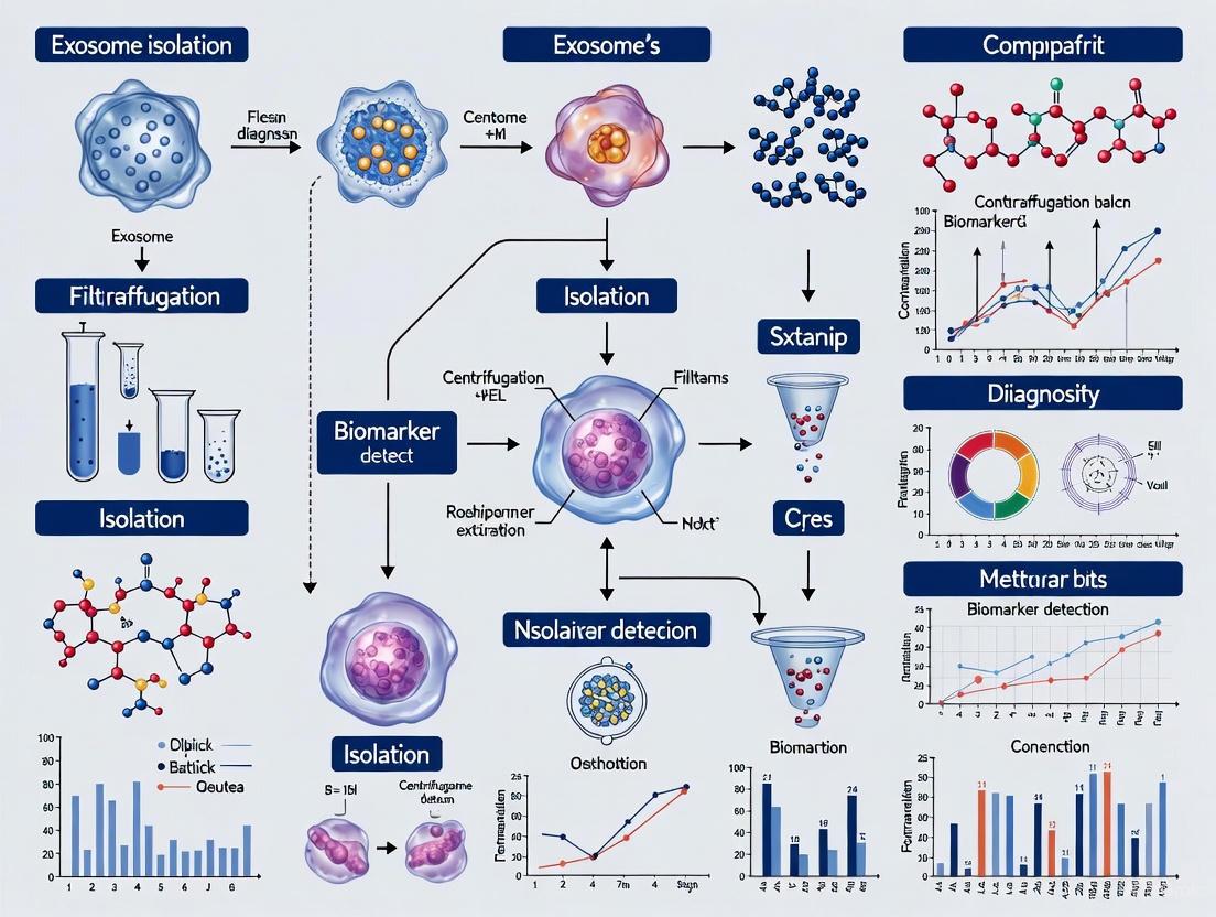 In cancer biology, tumor-derived exosomes have emerged as particularly valuable diagnostic resources because they carry oncoproteins, mutated DNA fragments, and cancer-specific RNA profiles that mirror the molecular characteristics of parent tumor cells [8] [11]. The stability of exosomes in various biological fluids—including blood, urine, saliva, and cerebrospinal fluid—combined with their accessibility through liquid biopsies, positions them as promising non-invasive biomarkers for cancer detection, monitoring, and prognostic assessment [12] [11]. The complexity of exosome isolation and analysis, however, presents significant challenges that must be addressed to fully exploit their diagnostic potential in clinical settings.